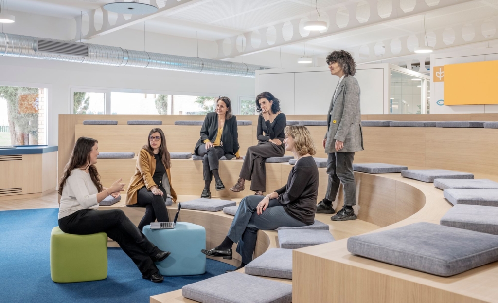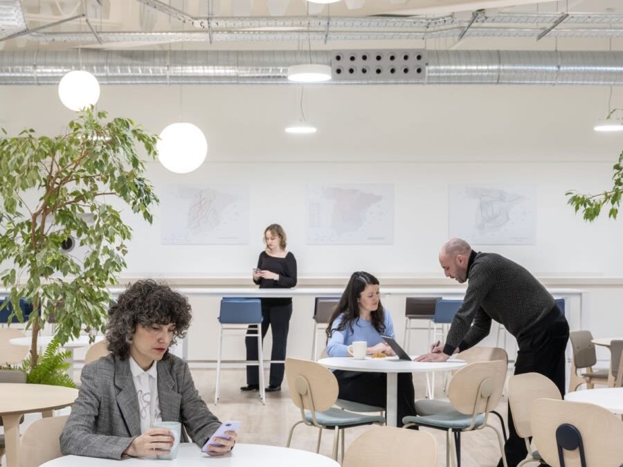 Estas oficinas son de coworking real, con mesas compartidas, cabinas de madera translúcida y equipos trabajando sin aislamiento visual. El diseño de Studio Banana, desarrollado junto a Telefónica Tech, huye del concepto de incubadora cerrada y apuesta por un entorno donde todo se ve y por lo tanto, todo conecta.
