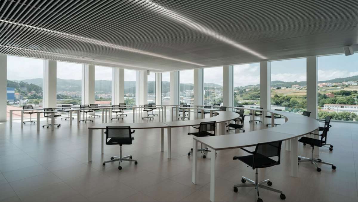 Pero el vidrio no es solo una decisión estética. Las enormes superficies acristaladas permiten que la luz natural recorra prácticamente todos los espacios de trabajo, algo especialmente valioso en un entorno como el gallego.