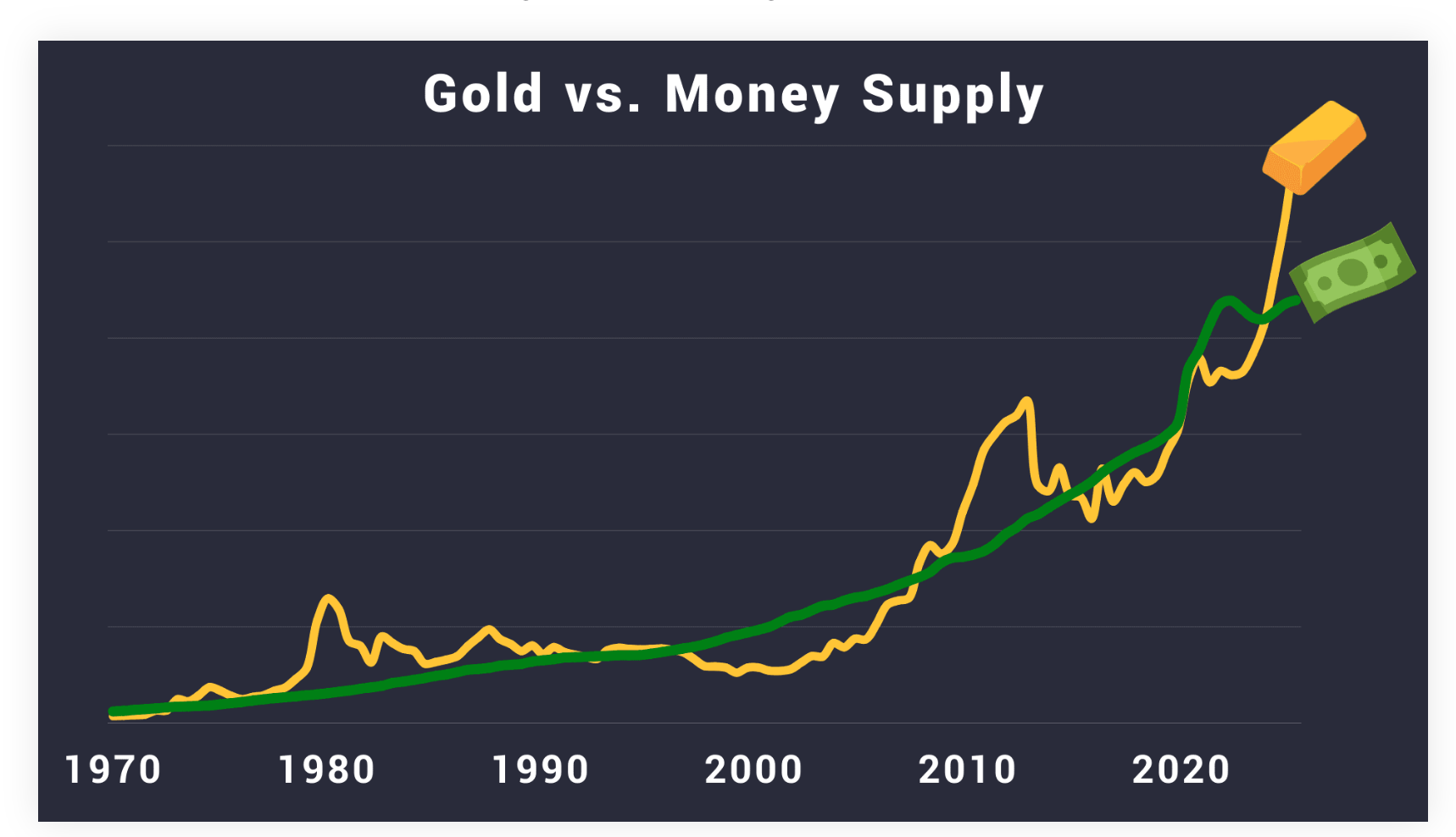 El oro ha sido casi desde siempre una reserva de valor y un activo que se ha utilizado para proteger el poder adquisitivo del dinero frente a la política monetaria. Por ejemplo, comprar una vivienda en lingotes de oro es ahora un 40% más barato que hace 50 años. Pese a la subida de la vivienda.
