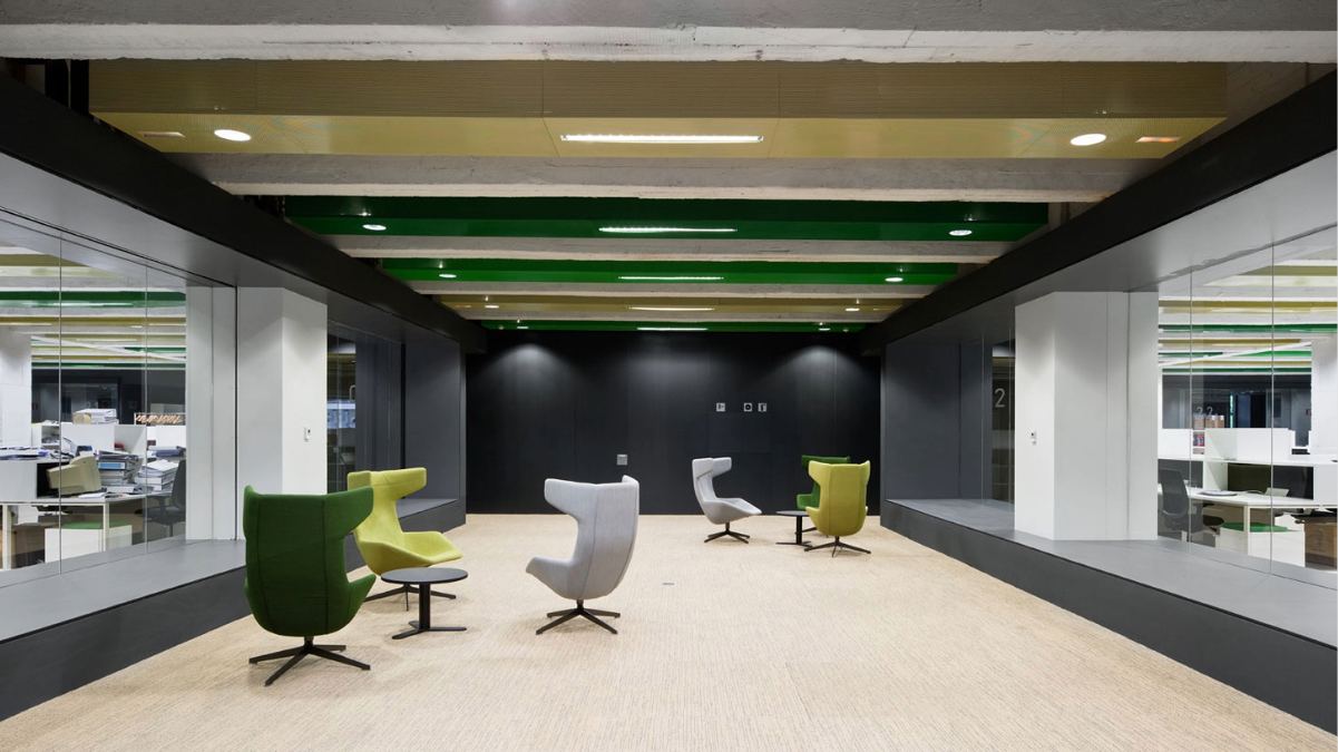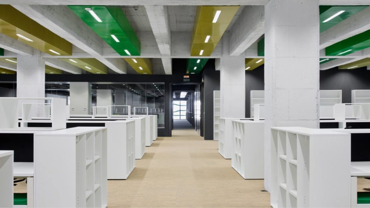 Los puestos se organizan en espacios abiertos, modulados por luz natural filtrada. Las lamas exteriores y la fachada acristalada permiten trabajar con iluminación eficiente y control térmico constante.