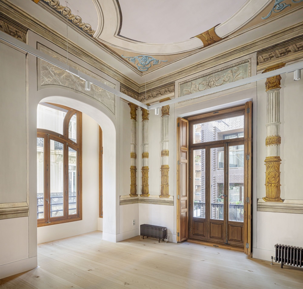 Las paredes blancas contrastan con columnas ornamentadas en tonos bronce y dorados. El pavimento claro refuerza la entrada de luz natural a través de los ventanales originales, mientras la carpintería restaurada mantiene la lectura histórica del inmueble.
