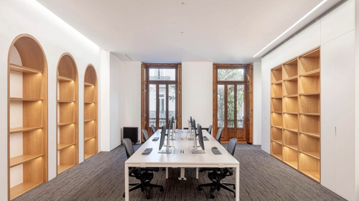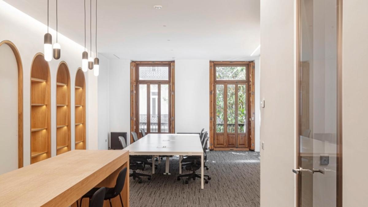Entramos y lo primero que impone no es el mobiliario, es el techo. Una pintura clásica domina la sala de reuniones principal y convierte el espacio en algo más cercano a un museo que a una oficina.