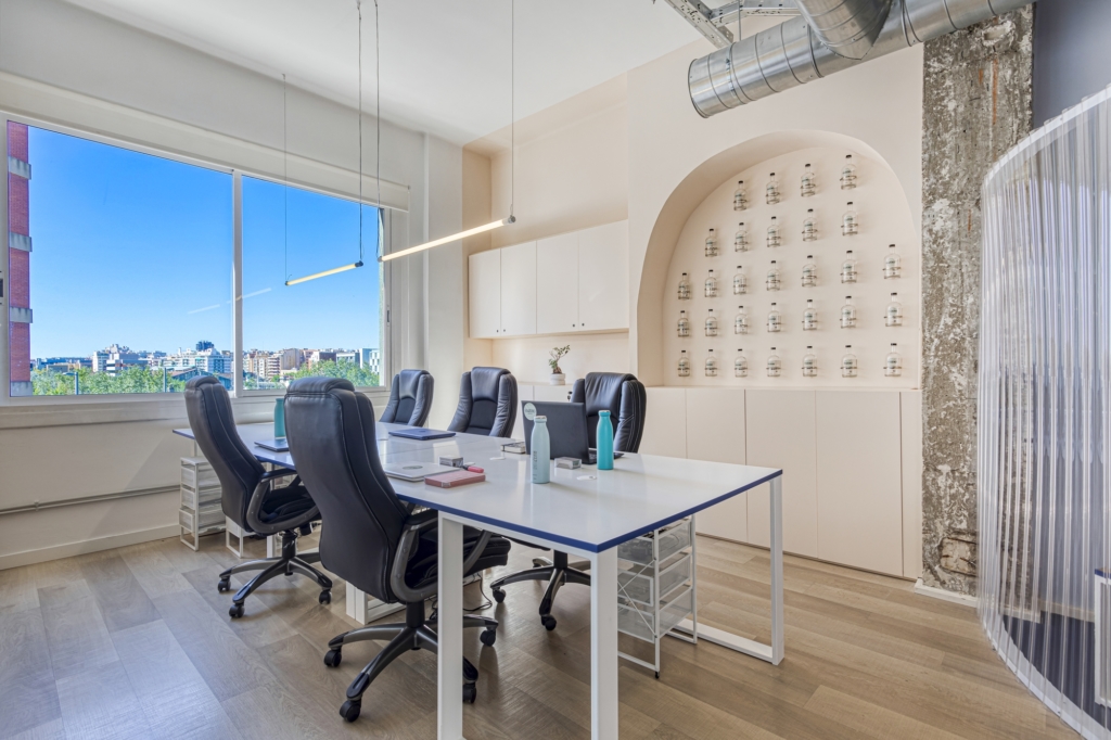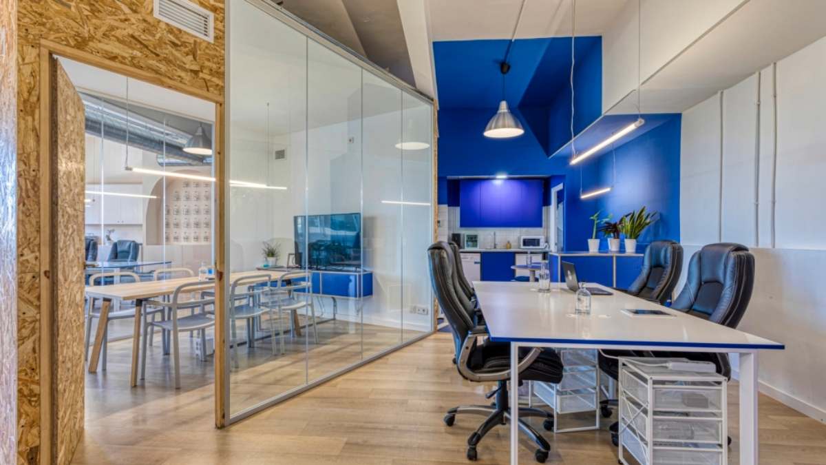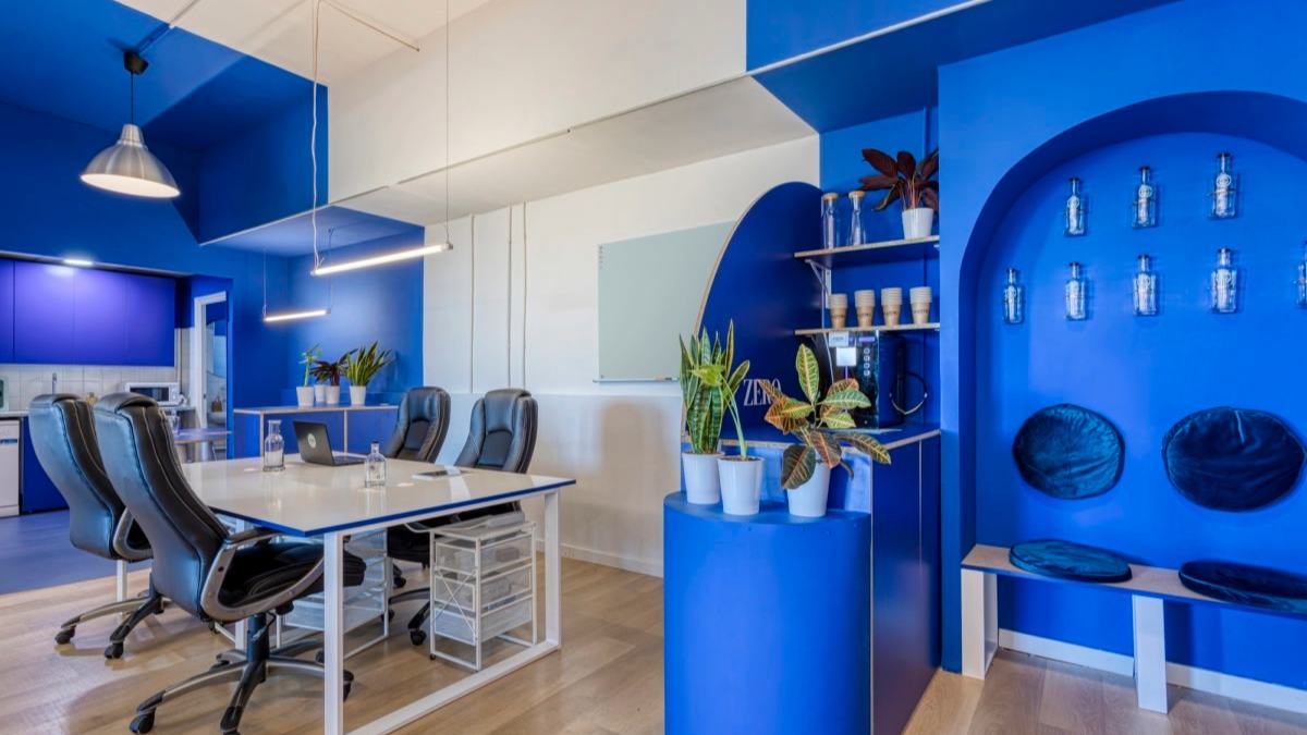 Entramos y lo primero que golpea es el azul eléctrico. No es solo un detalle, es la principal característica de estas oficinas. KMZERO, empresa vinculada al consumo de agua limpia y a la filosofía zero waste, convierte su oficina en una declaración visual desde el primer paso.