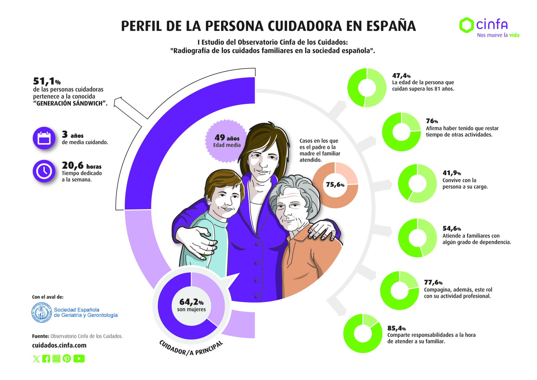 Además, cuatro de cada diez conviven con el familiar a su cargo y más de la mitad (54,6%) atienden a personas con algún grado de dependencia. Un dato especialmente relevante es que la mitad (51,1%) de las personas cuidadoras pertenecen a la denominada generación sándwich, es decir, atienden a sus progenitores al mismo tiempo que cuidan de sus hijos o hijas.