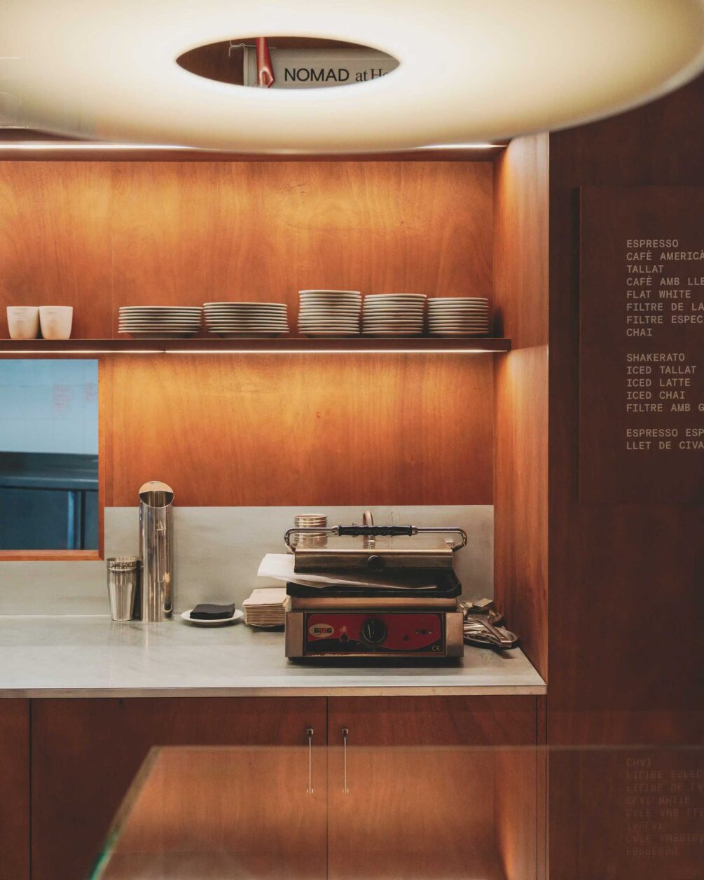 Nomad Coffee lleva años marcando la pauta de la nueva ola cafetera en Barcelona. Su local Frutas Selectas combina un ligero industrial con calidez mediterránea: tonos madera, paredes desnudas y maquinaria que exhibe su precisión como si fuera parte del paisaje.