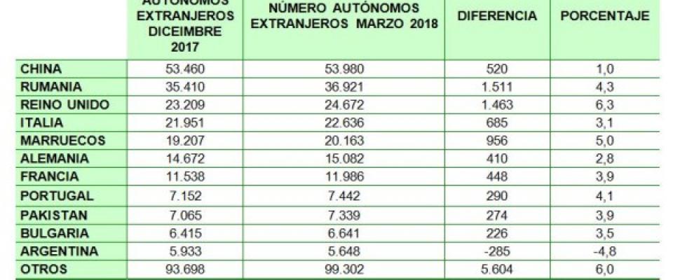 Así, los mayores incrementos de autónomos extranjeros en el primer trimestre del año los registraron los emprendedores procedentes de Reino Unido y Marruecos, que se incrementaron en el periodo analizado un 6,3% y +5%, respectivamente, lo que se traduce en 1.463 autónomos británicos más que en diciembre y 956 nuevas actividades puestas en marcha por ciudadanos marroquíes. Argentina ha sido la única nacionalidad de las más representativas analizadas que no ha logrado sumar autónomos durante los tres primeros meses del año y ha perdido 285 trabajadores por cuenta propia, lo que representa un descenso de 4,87% del colectivo autónomo argentino en nuestro país. Por su parte, el colectivo de autónomos chinos sigue aumentando pero con un crecimiento inferior al registrado años anteriores, concretamente un +1%, 520 autónomos chinos más en el trimestre hasta situar la cifra total en 53.980 autónomos. A pesar de ello, sigue siendo el colectivo más numeroso al representar al 17,9% de los autónomos extranjeros y seguidos muy de lejos por los rumanos, que representan el 11,8% del total.