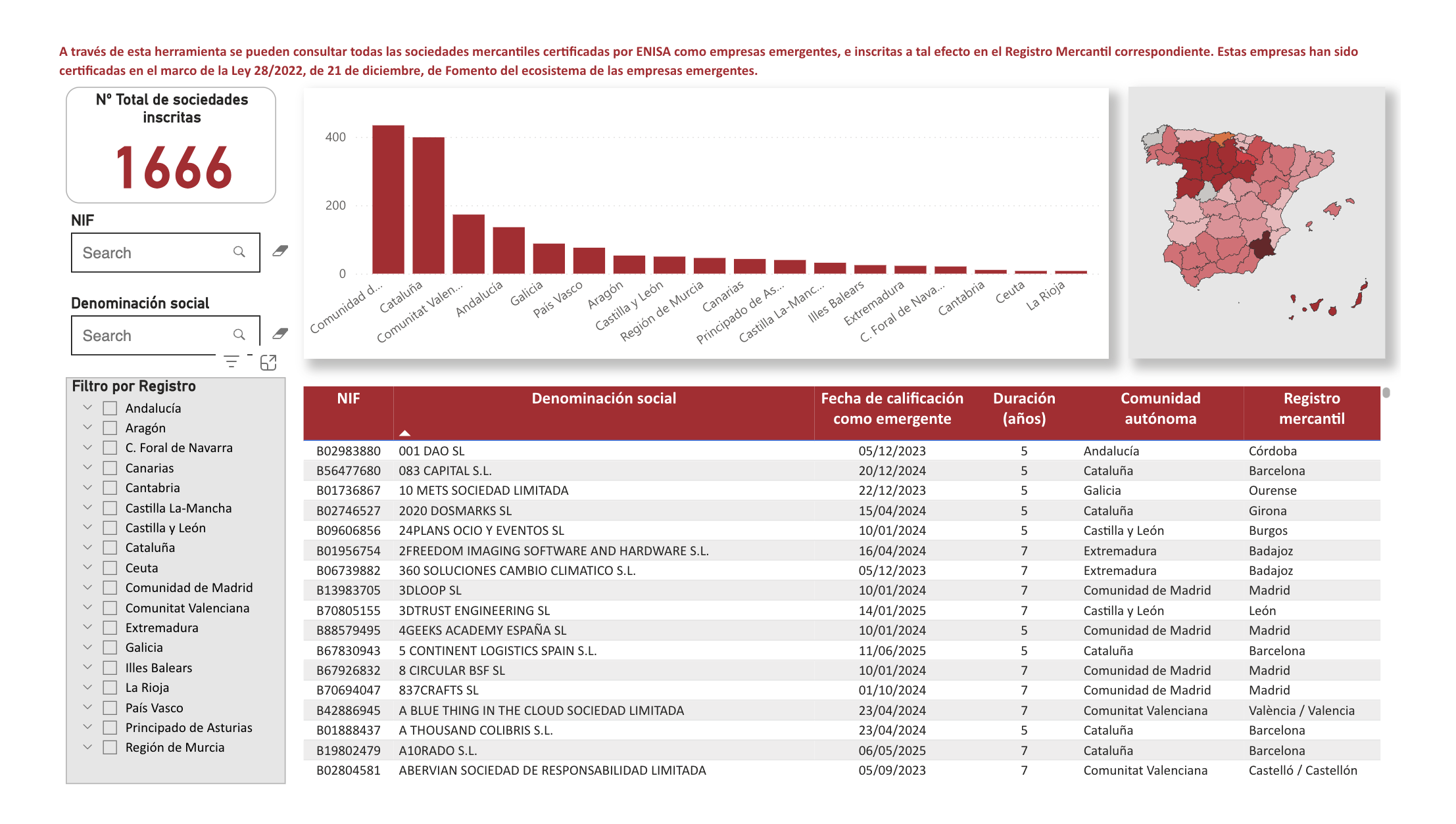 Los datos proceden del Colegio de Registradores, que permite consultar qué sociedades figuran como empresas emergentes según la Ley 28/2022, más conocida como Ley de Startups, registradas a través de Enisa.