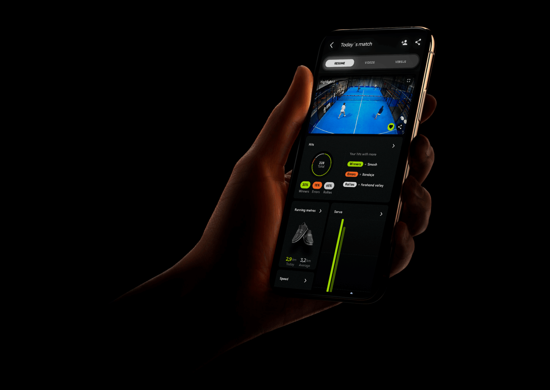 Gracias a un sistema de dos cámaras instaladas encima de la pista, la app analiza el partido en tiempo real y genera datos como velocidad de bola, promedio de golpes, mapa de calor, zona de control y errores por tipo de tiro.