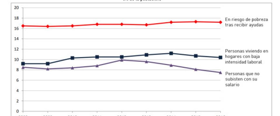 Después de tres aumentos consecutivos entre 2009 y 2012, la cuota alcanzó el 25% (cuatro de cada diez ciudadanos de la UE). Desde entonces, el número de personas en riesgo de pobreza y/o exclusión social bajó de forma continua hasta el 23,4% del año pasado, una tasa una décima superior a la de 2009. La reducción de esta población es uno de los objetivos de la estrategia Europa 2020. El mayor riesgo se da en Bulgaria y el menor en República Checa En 2016 hubo tres estados miembros donde más de un tercio de la población se contaba en riesgo de exclusión: Bulgaria (40,4%), Rumanía (38,8%) y Grecia (35,6%). En el lado opuesto se encuentran República Checa (13,3%), Finlandia (16,6%), Dinamarca (16,7%) y Países Bajos (16,8%). España se encuentra 4,5 puntos por encima de la media europea. Desde 2008, la tasa de personas en riesgo de pobreza se ha incrementado desde el 23,8% hasta el 27,9% del año pasado, lo que supone 12,8 millones de personas al borde de la pobreza o de la exclusión en nuestro país. Una de cada seis personas en la UE no llegan a fin de mes El 17,2% de la población de la Unión Europea se encontraban al borde de la pobreza tras recibir ayudas en 2016, lo que supone que su nivel de ingresos se situaba por debajo del umbral del riesgo de pobreza (por debajo del 60% de la mediana de ingresos de cada estado). Esta proporción ha descendido ligeramente en comparación con 2015 (17,3%), aunque está por encima del 16,5% de 2008. En España, la proporción es del 22,3%, lo que significa que uno de cada cinco no gana lo suficiente para mantenerse. Lo mismo ocurre en Bulgaria (22,9%), Lituania (21,9%), Letonia (21,8%), Estonia (21,7%), Grecia (21,2%) e Italia (19,9% según los últimos datos). La situación es más preocupante en Rumanía, donde el 25,3% de la población no puede mantenerse con lo que gana. Por otro lado, República Checa tiene un 9,7% de su población en esta situación, seguida de Finlandia (11,6%), Dinamarca (11,9%), Eslovaquia (12,7%) y Países Bajos (12,8%). Comparado con datos de 2008, la proporción de personas en este grupo se ha incrementado en 21 de los 28 Estados miembros, mientras que ha bajado en tan solo cuatro. Una de cada 13 no subsiste con su salario El 7,5% de los ciudadanos europeos en 2016 estaban materialmente privados de forma severa, lo que significa que sus condiciones vitales estaban condicionadas por una falta de medios como la incapacidad para pagar las facturas o poder mantener la casa caldeada o coger una semana de vacaciones fuera de casa. La proporción de este grupo ha descendido seis décimas con respecto a 2015, aunque se encuentra lejos del 8,5% de 2008. Una de cada 10 no trabaja lo suficiente para mantenerse El 10,4% de los ciudadanos de la UE hasta los 60 años vivían en 2016 en hogares donde los adultos trabajaron un 20% por debajo de su capacidad en los 12 últimos meses. Es decir, las personas con trabajo a tiempo parcial o los parados de media y larga duración. Es el segundo año consecutivo en el que este porcentaje decrece en la UE. España tiene una de las poblaciones más altas de este tipo: un 14,9% en 2016; superado solo por Irlanda (19,25%, según los últimos datos) y Grecia (17,2%).
